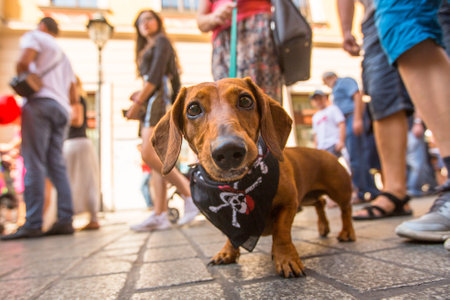 KRAKOW, POLAND - FEB 11, 2016: Dog party in the annual 22nd Dachshund Parade (Marsz Jamnikow) on the Main Market Square. Parade costumed sausage dogs through Cracow has hosted every autumn since 1994.