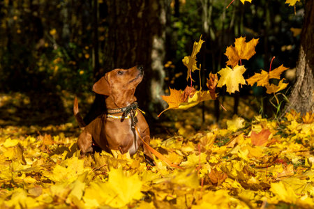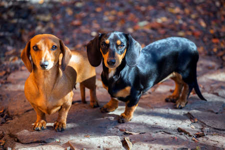 Funny dachshund dog on a walk in the park outside. Portrait close up