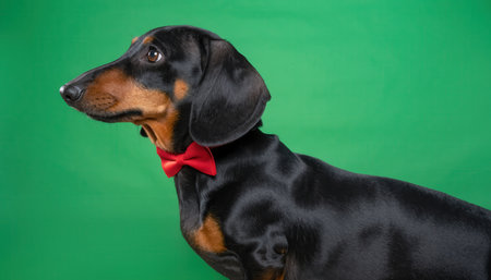 A studio portrait of a black and tan dachshund dog wearing a red bowtie, set against a solid green background.