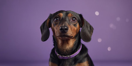 AI Generated. Curious Dachshund with head tilted on a purple background with copy space,