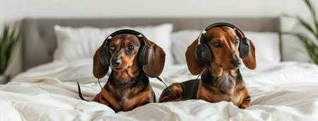 two dachshund dogs, each sporting headphones, snuggled on a white bed, presenting a delightful and humorous moment ideal for animal photography