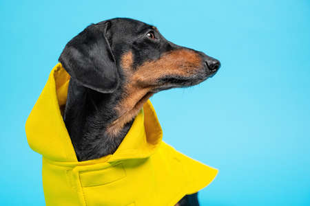 Funny black and tan dachshund wearing bright yellow coat with a hood, looking to the right. Long nose profile, blue background, copy space.