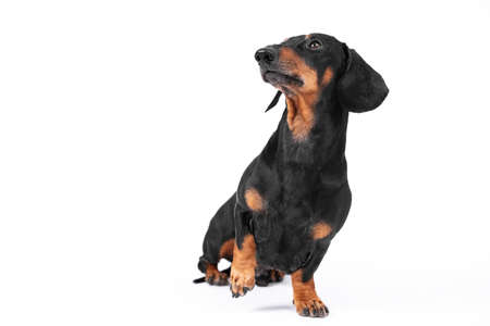 close up of a cute teckel dog with black fur looking to a side happy on yellow studio background