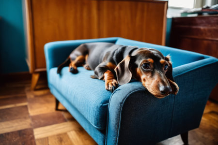 One year old smooth brown dachshund dog sitting on the cushions and a throw on a sofa inside the apartment, looking to the side, in the evening, moody lighting.