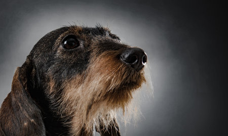 Adorable Close Up of a Sweet and Expressive Dachshund Puppy with an Innocent Demeanor on Gray