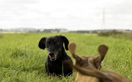 Dog breed Dachshund running around in the meadow. Beautiful grass and bright sun.