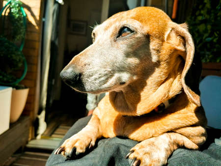 Red dog breed Dachshund. Close up. Gray-haired adult dog. Hunting dog. Portrait of a pet. Selective focus.