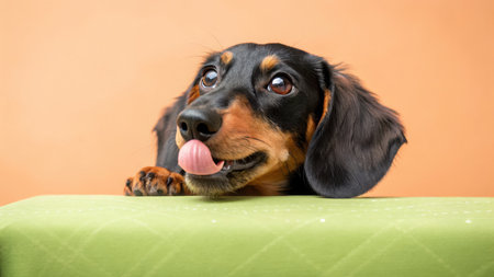 A black and tan Dachshund rests its paws on a light green surface, its tongue playfully sticking out. The dog looks up inquisitively. The background is a solid, muted orange. The overall feeling is one of happy curiosity. The image is well-lit and sharply focused.