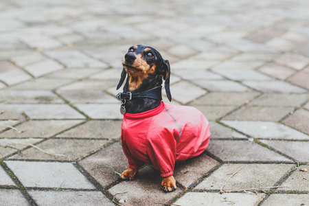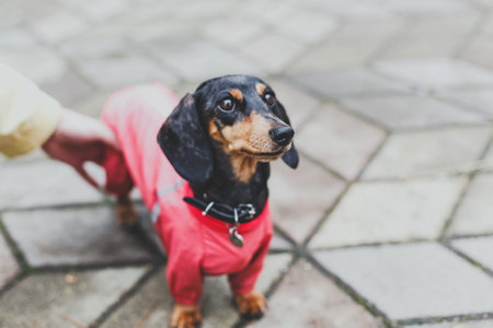 Small black dapple dachshund in bright red clothes sitting on stone tiles, looking alert and stylish on a chilly day, concept of pets