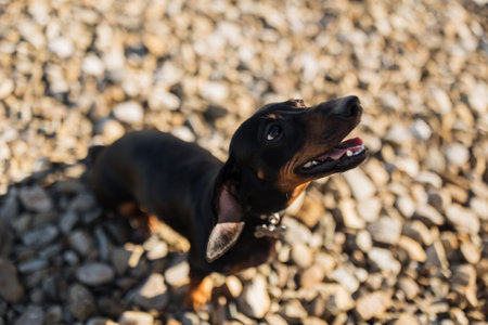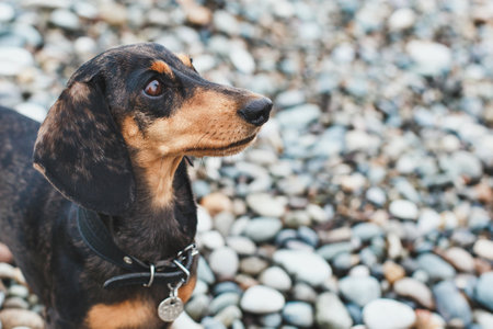 Close-up of black dachshund with dapple coat standing on pebble beach and gazing into distance with focused and calm expression, natural outdoor scene, concept of pet exploration, copyspace