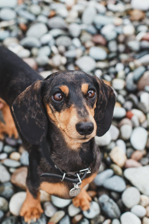 Vertical close-up portrait of black dapple dachshund dog with big eyes standing on pebble beach and looking up, concept of pets and love