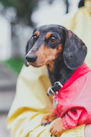 Black dapple dachshund dog in red jacket standing on stone pavement, looking away with curious expression while held by owner, concept of pets and friendship