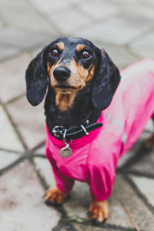 Black dachshund with dapple coat in pink jumpsuit sitting on city pavement and looking up with faithful eyes, cozy and touching outdoor scene, concept of pet care