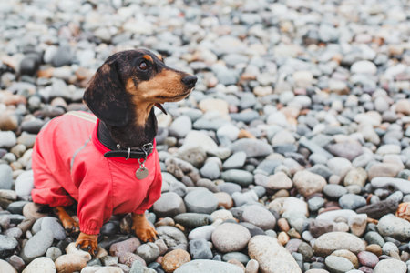 Dachshund dog wearing red jacket sitting on pebble beach near sea, small black tan pet looking aside, calm seaside atmosphere, travel lifestyle copyspace concept