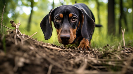 Dachshund in forest. Cute adorable dog having a walk. Generative AI
