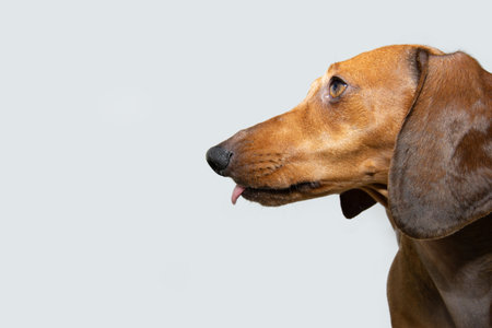 Profile brown dachshund puppy dog sticking tongue out. Isolated on white background