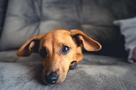 Cute small sausage dog 10 weeks old on the gray sofa indoor