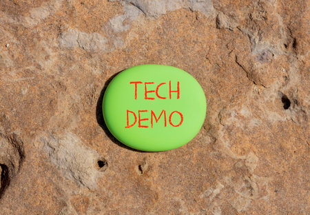Tech demo symbol. Concept word Tech demo on beautiful green stone. Beautiful red brown stone background. Business tech demo concept. Copy space.