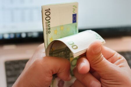 Euro banknotes on laptop keyboard. Concept of cash money, digital payments and financial transactions