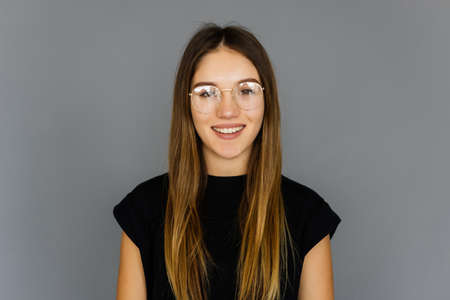 Smiling young woman in black jacket standing in front of blue sky enjoying bright sunlight. Mental health, relaxation, freedom concept. Girl in casual outfit with closed eyes. Golden hour sunlight