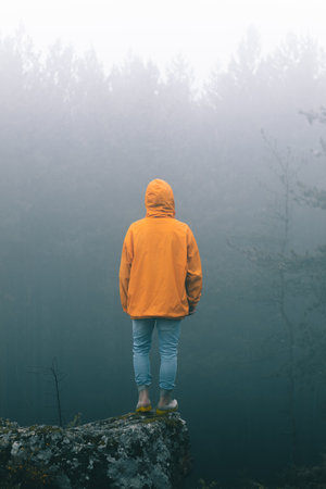 Bulgaria - 05 22 2024: Man with vibrant orange jacket and jeans standing on the edge of a rock looking at the bright light over the trees with a lot of fog.