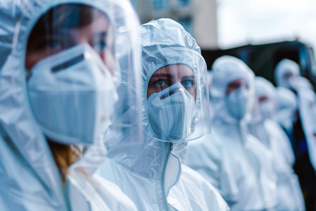 Healthcare workers in blue PPE suits and masks, prepared for duty during the health crisis. Generative AI