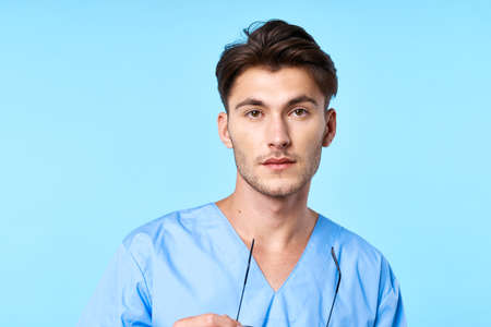 Anonymous men in surgeon uniform putting on latex gloves while standing in hospital hallway