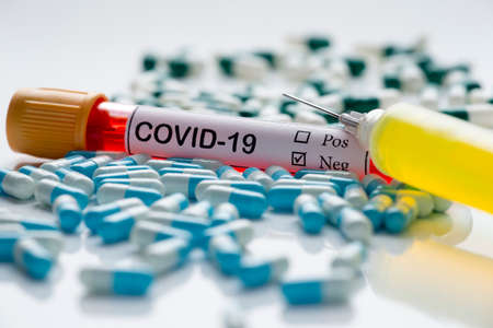 blood collection tube for clinical analysis, with covid-19 label, and capsules of medicine pills