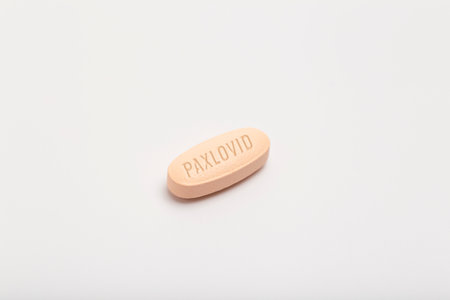 A white bottle of covid-19 antiviral pills in the laboratory. Concept of the new antiretroviral treatment pill Covid-19.