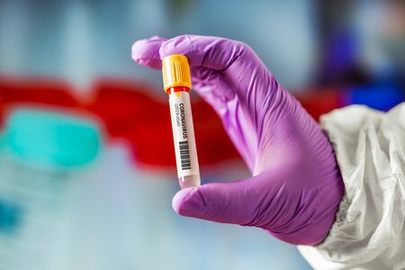 Coronavirus test. Hand in gloves holds a test tube with a corona virus test label on blurred laboratory in the background. COVID-19 or SARS-CoV-2 test concept.