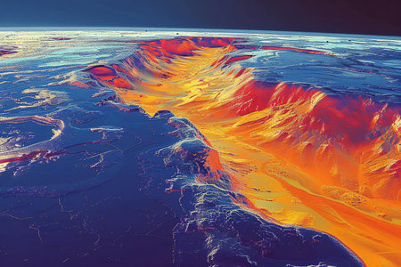 Detailed view of an active lava flow, hot magma emerges from a crack in the earth, the glowing lava appears in strong yellows and reds. lava ocean entry in the morning.