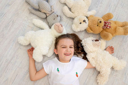 Childs hands holding a knitted teddy bear, a soft and comforting toy. Playtime and childhood memories concept. For a kids gift.