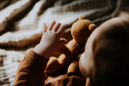 Tender moment of a child's hand reaching towards a small brown teddy bear on a soft, blurred fabric background, highlighting the innocence and comfort of childhood. subtle grain, soft focus edges