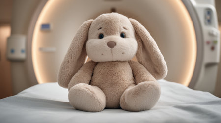 A cozy plush rabbit toy sits on an examination table inside a bright MRI scanner room, symbolizing comfort and care for children in medical environments.