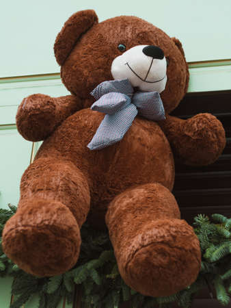 Soft brown bear toys on shop window. Christmas fair store decorated with gifts garland lights illuminated. New year retail market exterior design. Xmas holiday celebration. Plush animals decorations.