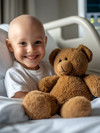 Smiling child with teddy bear in hospital bed, hope and strength in recovery concept, AI generated