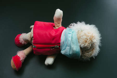 Cute teddy bear, school blank black chalkboard background. Kids learning, children class concept.
