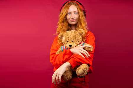 Red-haired girl with a bear in her arms. Listens to music with headphones, posing. Photo on a red background with empty space. High quality photo
