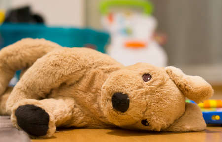 A charming plush toy puppy sits on a vibrant quilt, showcasing a cozy indoor space filled with warm colors and natural light, perfect for playtime.
