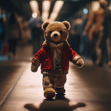 An AI generated illustration of A plush teddy bear sitting on the floor in the foreground of a room filled with people