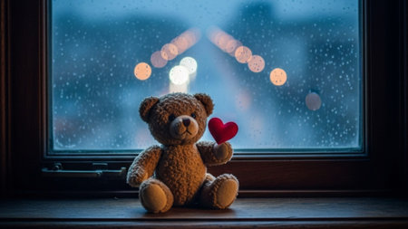 Teddy bear wating alone beside the window with warm sun flare as lonely or happy childhood concept.