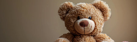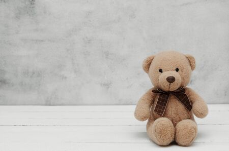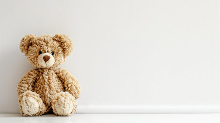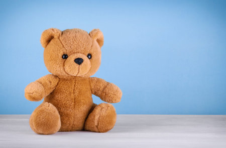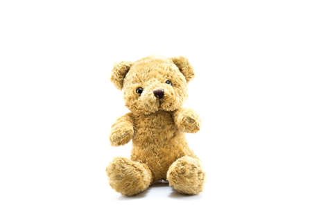 Plush brown toy bear sitting against a white background. Childhood companion. Concept of childhood, comfort, nostalgia, innocence. Copy space.