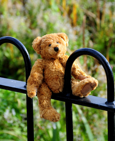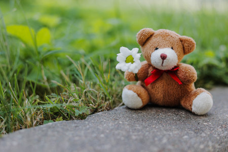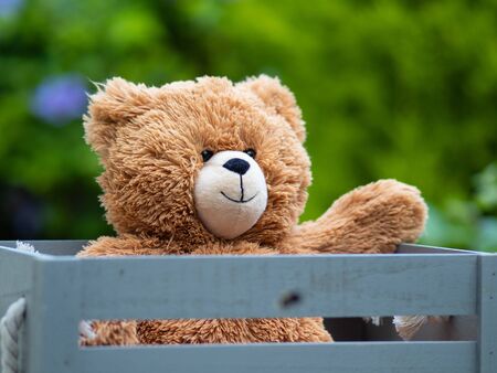 Smiling Teddy bear best friends toy for kids. Adorable Fluffy Brown Teddy Bear happy in green park. Happy fun friend fluffy cute toy doll sitting at garden. Stuffed Toy for kids Family childhood