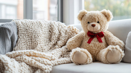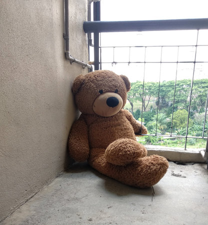 Dramatic photo of Teddy bear is sitting on sofa in dark room with sunlight shining from window, lowkey light shot of Lonely teddy lying down alone in living room international missing children's day