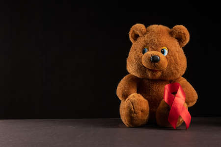 Teddy Bear with Red ribbon HIV, AIDS on dark background, Awareness, Medical sign. copy space.