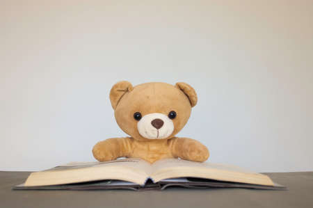 Plush bear with book and mug against logs background. Copy space for text. Education background.