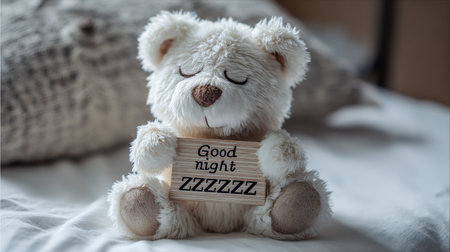A cuddly, plush teddy bear gently cradles a wooden sign displaying ?good night zzzzzz,? nestled on a plush bed surrounded by inviting pillows in a warm, tranquil bedroom.