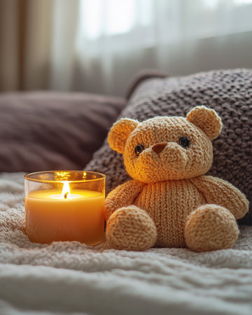 A snug bedroom setup featuring a handmade teddy bear next to a glowing candle on plush bedding, creating a peaceful and inviting atmosphere.