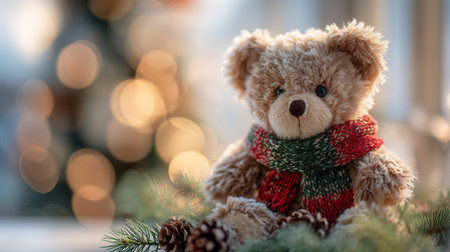 A charming plush bear wrapped in a seasonal scarf nestles among pine needles and cones, illuminated by cozy holiday glow and twinkling lights.