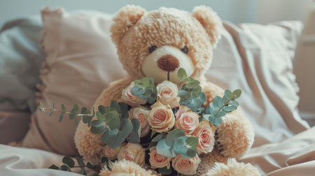 Flowers and gifts for women's day. Mother's day greeting card. Stuffed toys Bear. Bouquet of flowers in vase. Happy Birthday! Valentine's day gift. 14th February. Love concept.